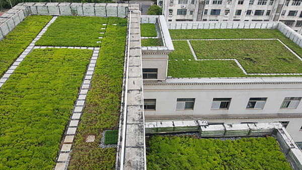 屋頂綠化完成后,四季常青,具有良好的觀賞和美化效果,能夠阻隔紫外線對屋頂防水的破壞,降低城市熱島效應(yīng),吸收粉塵及其大氣污染物,阻擊PM2.5污染、降低城市噪音、增加負(fù)氧離子。